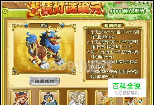 5个NPC的猜灯谜和闹元宵都通过了就可以领取年兽了哦!
