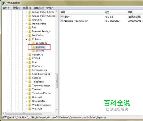 首先在开始菜单搜索框里输入“regedit”,回车启动注册表编辑器,接着定位到:HKEY_Current_USER\Software\Microsoft\Windows\CurrentVersion\Policies\Explorer;