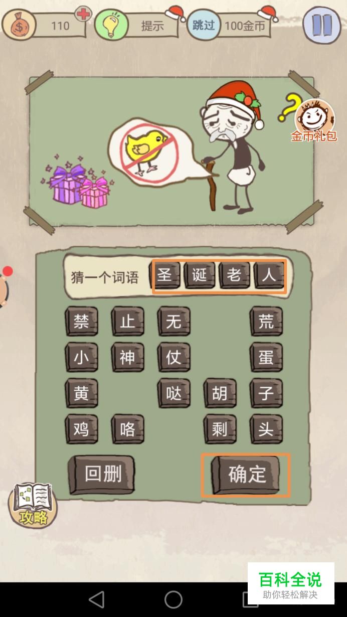 第1关、坑爹猜成语 没有小鸡鸡的“剩蛋”老人就是圣诞老人啦,依次点击“圣”、“诞”、“老”、“人”,再点击“确定”就通关啦!