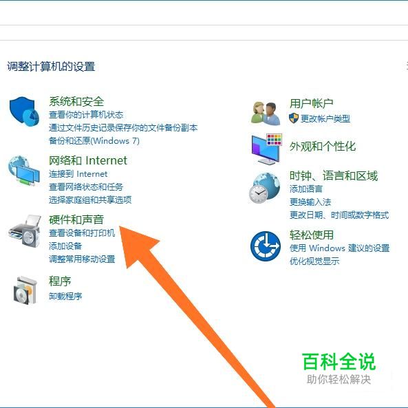 进入到“控制面板”后,点击进入“硬件和声音”设置选项。