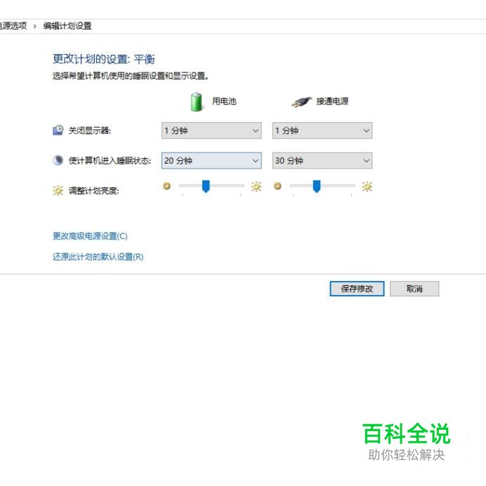 最后就进入到了“编辑计划设置”界面,因为笔记本电脑有用电池和接通电源两种使用方式,所以也有两种设置情况。设置好时间之后,点击“保存更改”即可。