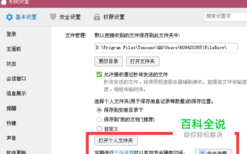 先QQ面板的---主菜单---系统设置,进入,找到左侧的文件管理。
