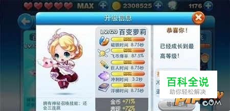 天天酷跑是当下i较热门的酷跑类手机网游,该游戏一经推出就备受玩家的喜爱。在这次的情人节活动中,天天酷跑推出了全新的人物、宠物,再次勾起了玩家们的热情。那么新出的人物百变萝莉能力如何?刷分能力强不强?下面,薄暮就用满级的百变萝莉来测试下她的得分能力。 120级满级百变萝莉属性如图: 小编进20钻场,用闪电豹+假面狮跑了15000米,说一下个人的感受。冲刺磁铁则个技能表现很一般,时间太短了。至于技能加成方面,10倍bouns不算高,在正常范围,20%表现也还好,至于400%的飞币则感觉没用。这也许也是因为假面已经有了4倍飞币,已经达到顶值了吧。200%踩怪和祝福抽2倍一样原有基础+1,虽然没有试过,但是个人猜测4倍的踩怪应该也是最高值了。级配假面的得分表现而言,百变萝莉的确比金枪小飞要好不少。 接着我又用萝莉配梦幻神马试了下····