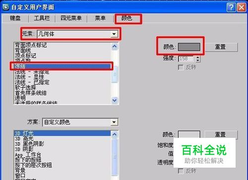 2:在展开的“自定义用户界面”界面中选择“颜色”---然后下面就会弹出关于设置颜色的卷展栏。具体设置如下。