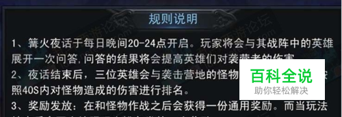 每天20-24点开启,玩家首先需要回答10道夜话问题,其中包括一些神话故事、古诗词 和历史常识,每一题有20秒答题时间。答题越多,能够帮助你接下来的战斗。