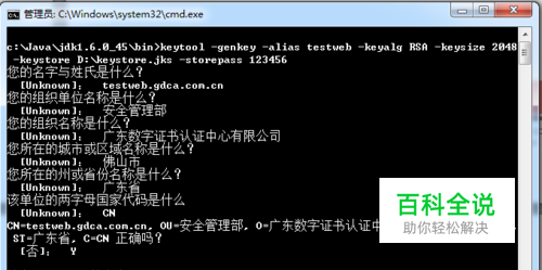 提示是否信任该证书,填 : Y; 然后输入命令:keytool -import -alias GDCA_TrustAUTH_R4_Extended_Validation_SSL_CA -keystore D:\keystore.jks -trustcacerts -storepass 123456 -file D:\GDCA_TrustAUTH_R4_Extended_Validation_SSL_CA.cer