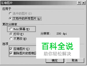 在弹出的“压缩图片”(如图2)窗口中,点击“更改分辨率”选项,将分辨率从默认的“打印”(分辨率200dpi)选项改为“Web/屏幕”(分辨率96dpi)。再将“选项”中的“压缩图片”和“删除图片的剪裁区域”复选框选中。