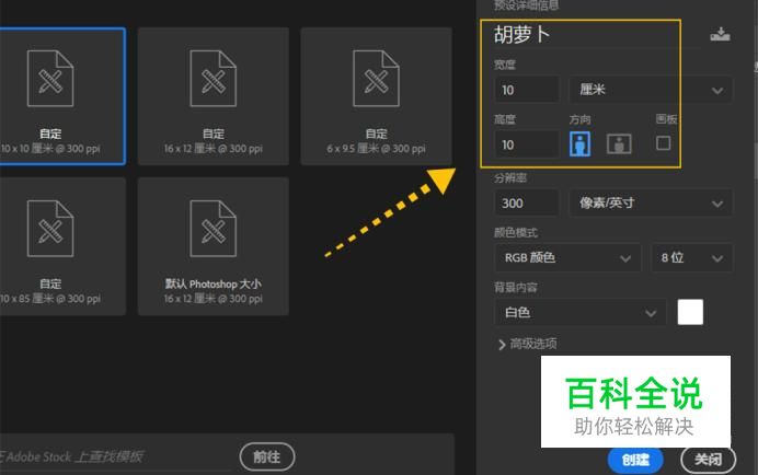 首先,我们打开电脑中的PS CC2018的软件;接着我们新建一个名字为“胡萝卜”的PS文件,大小为10厘米*10厘米就可以,如下图所示。