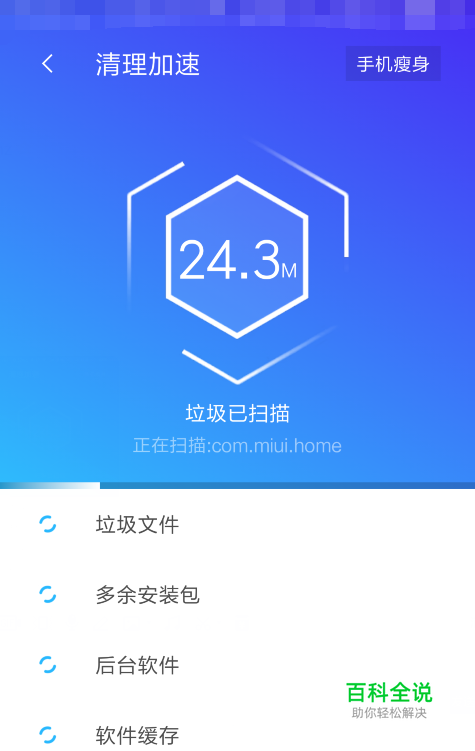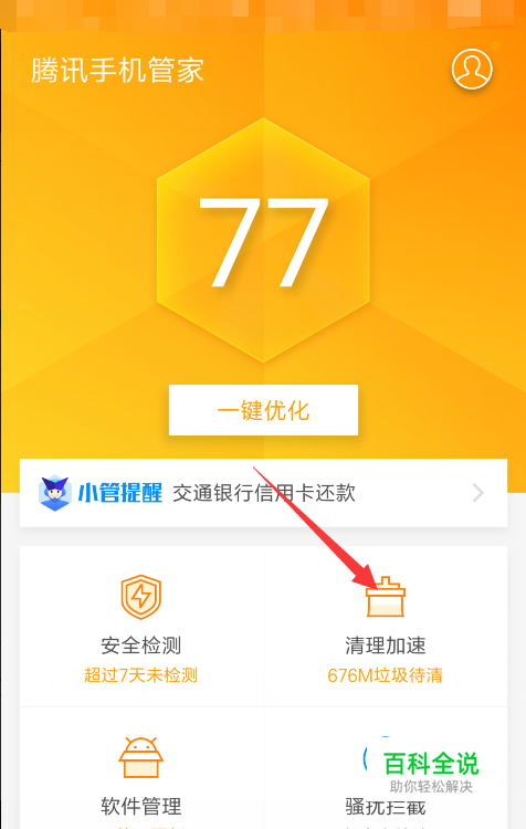 入腾讯手机管家的清理加速功能,等待软件扫描手机中的垃圾文件等。