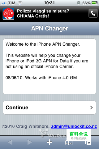 开始使用此插件时必须上网一次! 首先在SAFARI中打开这地址www.unlockit.co.nz 直接点击continue