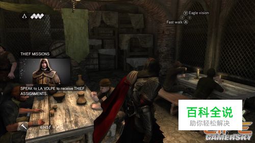 La Volpe打算重建盗贼公会的据点,交谈结束后,玩家操作Ezio与一旁的建筑师(Architect)交谈,就能把旁边的一栋旧房子改建成客栈,连带修复旁边的地道入口。建立盗贼公会的据点后,Ezio请La Volpe利用间谍找出苹果的所在;绕到客栈大厅后的赌桌,可以与La Volpe交谈并解开额外的盗贼支线任务。另外,现在玩家可以雇用盗贼协助战斗与扰敌,并且在地图上的无人据点花钱让盗贼进驻,让盗贼常驻于该地、便于雇用。
