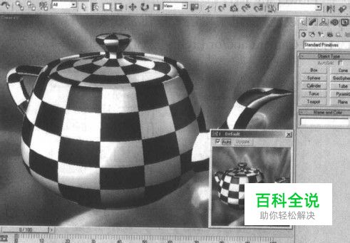 (5)在材质编辑器的中激活赋予茶壶的示例球,在垂直工具栏中按下Background按钮,显示出背景.然后按住Sample Type按钮不放,在弹出的扩展按钮中选择最后一个按钮。在示例窗中可以看到示例球变成了茶壶形状。(6)展开Blinn Basic Parameters卷展栏,然后单击Diffuse颜色框后面的小按钮,在弹出的对话框中双击Checker贴图。按下水平工具栏中的显示贴图按钮,在摄影机视图中可以看到,示例球和视图中显示的结果完全一致,如图4-15所示。3dmax材质编辑器打造自定义示例球完成。