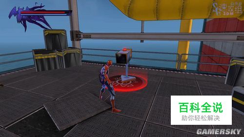 CG结束后进入前方的房间,地上会钻出来个摄像头,破坏掉然后出去。从房间出来后BOSS派来一群杂兵,打不打都无所谓,主要是要摧毁那些摄像头,切换视觉模式找到摄像头, 全部破坏掉。第一破坏掉之后又会出来一批,继续找,来到图中的屋子后会被关住,然后和一群小兵打, 杀光小兵后出来个拿锤子的大块头,不浪费时间了,狂暴状态解决,然后离开屋子这个在铁网里面的摄像机已接近就会喷火,我们从旁边贴墙过去,到铁网前立刻狂暴状态就能破坏掉。 其他的还有飞在空中的,按住A上到高空后按在B踹烂就可以。还有的摄像机离近了会自动缩回地下,这种在远处扔东西砸烂即可。直接和他硬拼,他用攻击时躲开,一直在地上滚,他会用枪扫射,还会扔炸弹,等他停下拿出刀来继续打, 看到她蹲在地上休息的时候不要过去攻击,扔过东西去砸他。等他交出小兵来后我们干掉小兵,找出他的位置, 近身按B把他放倒。没血了之后他会开船逃跑,我们追上去。