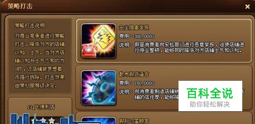 策略打击,顾名思义就是对商业竞争者进行一定商业行为打击,降低对方的店铺认知、士气。当对方店铺认知与士气之和均为0时,该店铺被梦想都市强行拆除,打击的效果是由策划部等级决定。策略打击分3种,安全隐患举报、散布假货谣言、假扮刁蛮顾客。