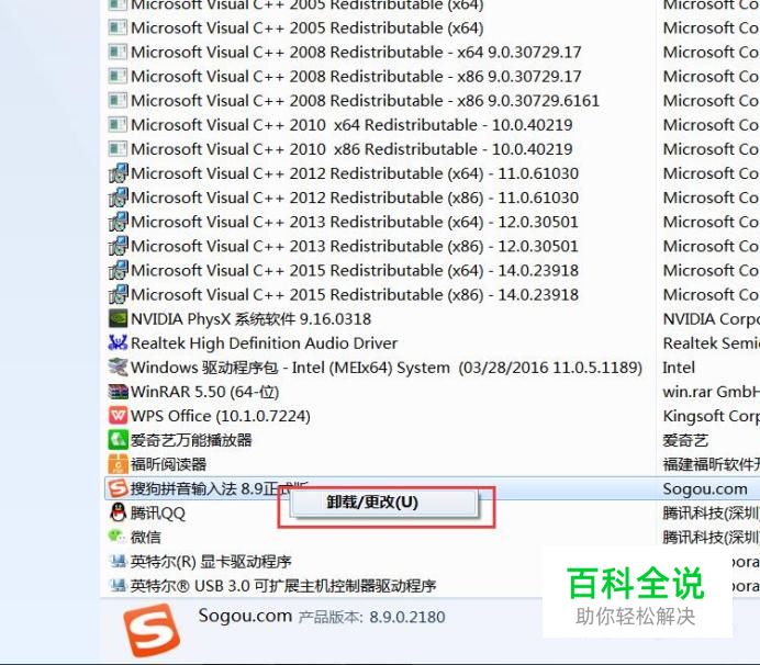 一般情况下,搜狗输入法程序不见了是因为输入法程序设置遭到破坏导致的,可以尝试修复一下,打开系统控制面板-程序和功能设置,右键点击安装的搜狗输入法程序,选择“卸载/更改”按钮。
