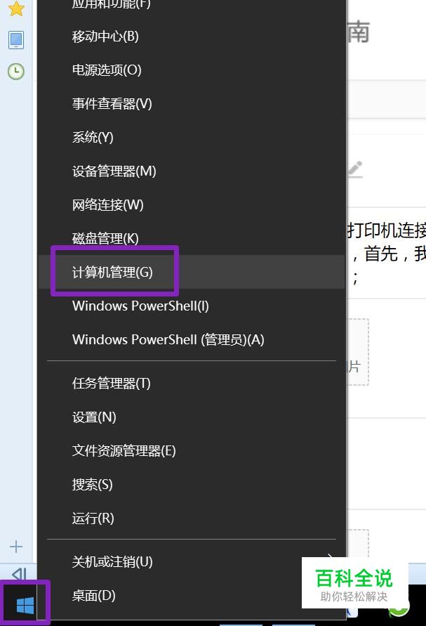 一般打印机连接不上电脑是因为电脑上面的一个程序被我们关闭了,从而无法打印,首先,我们右击电脑左下角的微软按钮,弹出的界面,我们选择计算机管理;