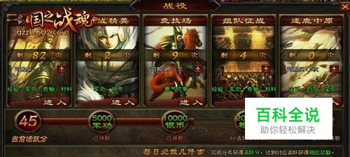 战役蔓延的压力令人窒息,战役带来的刺激使人疯狂!在这个物欲横流,以实力说话的三国年代,武力挑战极尽平凡。三国乱世,三国之路由你创造!《国之战魂》是一款战棋策略类网页游戏,三国征战,战术多变。是王是寇,一战定输赢! “不是英雄,不读三国,若是英雄,怎么能不懂寂寞.....东汉末年分三国,烽火连天不休”。热爱三国史记的三国迷们,心中定时豪情万丈。三国是一本读不完的书,耐人寻味,三国战术更是需要我们玩家细细品读!战争是忠贞爱国,铮铮热血男儿终身事业,生于战场亦死于战场!在《国之战魂》中战役纷繁不断,分别有个人战役、挑战精英、竞技场、组队征战以及逐鹿中原! 有战争的地方就会有伤亡,在《国之战魂》战役玩法中,想要获得胜利的果实,就需要每一场战斗都准备充足。战斗之前,使自己的实力达到最大化。游戏中成功完成挑战精英将会有军功与将灵的奖励,第一次通过挑战精英将会额外获得4000军功,而我们玩家每天将会有10次进入挑战精英的机会,但是每个精英只能免费挑战一次,想要再次挑战已经挑战过得精英将需要花费相应的黄金!丰厚的奖励,拿到你手软噢! “都护行营太白西,角声一动胡天晓”。 从古至今军功都一直备受很多将士英雄的追捧,也是将士戎马一生的证明。在6《国之战魂》中,军功同样非常重要,英雄的等级提升需要消耗军功。游戏中挑战精英副本中是获得军功的主要途径,在战役系统中,如果达到一定的活跃值,也是有军功奖励的哦!烽火狼烟的战役,英雄们,来挑战吧!