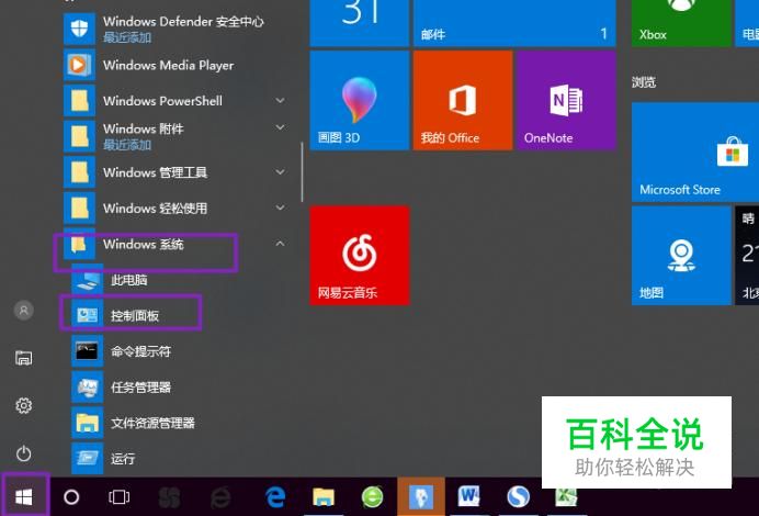 首先,我们点击电脑左下角的微软按钮,弹出的界面,我们下拉,找到windows系统,然后点击打开,然后点击控制面板;