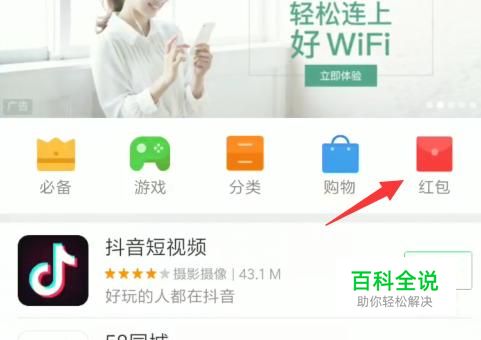 然后我们进入应用商店的首页,在首页的上侧找到“红包”的字样,点击进入就会有相应的提示。