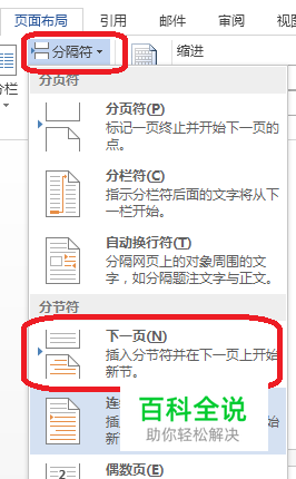 单击“页面布局”找到“分隔符”再找到“下一页”并单击,依次完成下面的页码操作