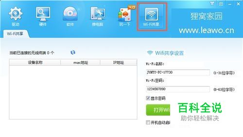首先我们启动无线路由软件,注意的是如果你的笔记本电脑没有无线设备的,软件上不会出现(如下图所示)的“Wi-Fi共享”按钮。