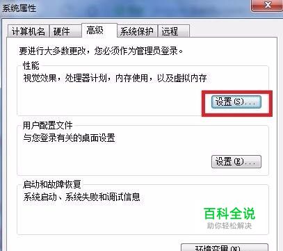 系统属性选项卡中点击〈高级系统设置〉,再点击《性能》下的《设置》