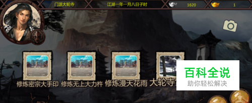 进入门派后,有四个选项,前三个分别是修习密宗大手印,无上大力杵以及漫天花雨。第四个是进入大轮寺雪山,点开后发现另一番天地,又出现四个画面。前两个是修习属性。第四个是返回到上一个画面。