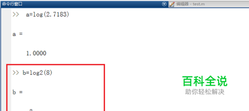 第二步介绍以2为底的对数函数log2(x),在命令行窗口中输入b=log2(8),按回车键,可以看到b=3,如下图所示: