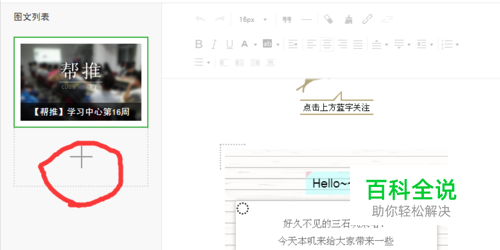 进入编辑页面之后,如图所示,在页面的最右侧,有一个加号(已用红圈),点击加号之后,就可以在下面再加一个空的图文页面。这个页面在刚才的图文的下面,也就是已经把之前上面那篇图文作为头条了。