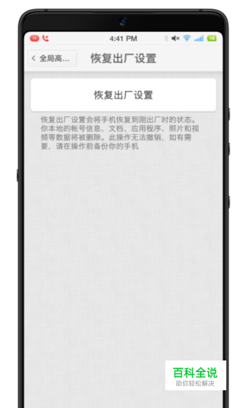 输入完毕后,就可以看到恢复出厂设置的选项,页面会给出恢复出厂设置后,个人资料会清除的提醒,我们点击该选项。