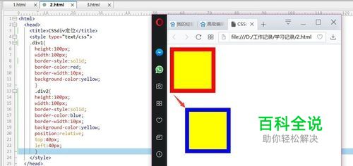 相对定位:首先给div2使用 相对定位,用position:relative;来实现的,具体的代码如下: <html> <head> <title>CSSdiv定位</title> <style type="text/css"> .div1{ height:100px; width:100px; border-style:solid; border-color:red; border-width:10px; background-color:yellow; } .div2{ height:100px; width:100px; border-style:solid; border-color:blue; border-width:10px; background-color:yellow; position:relative; top:40px; left:40px; } </style> </head> <body> <div class="div1"> </div> <div class="div2"> </div> </body> </html> 可以看到如下图,div2的位置离div1的位置偏移了上边四十个像素,左边四十个像素。
