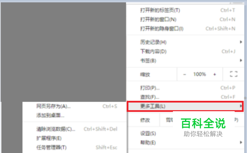 点击浏览器右上角的三字按钮,选择更多工具点击网页另存为。