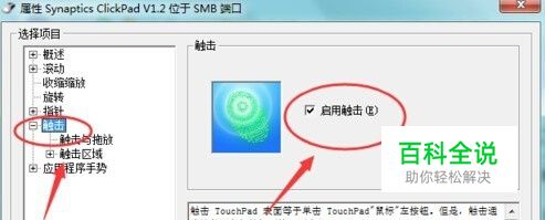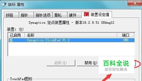 在打开的鼠标属性窗口中,咱们将界面切换到切换到“装置设定值”,然后点击“设定值”按钮,之后,咱们点击进入“设定值”以后,找到并点击“触击”,然后在右侧勾选“启用触击”,这样就可以了