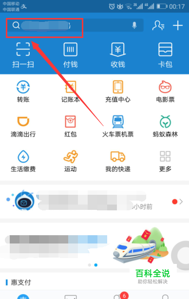 打开支付宝app进到主页面,点击搜索进去