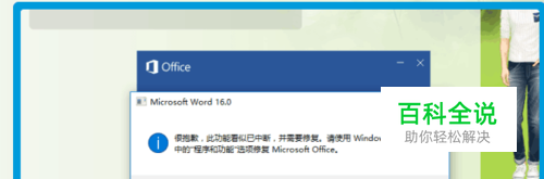 问题描述是这样的,很抱歉,此功能看似中断,并需要修复,请使用windows控制面板中的程序和功能“选项修复”Microsoft office;这是原话的描述,笔者处理很多次office终于成功了。分享给大家。