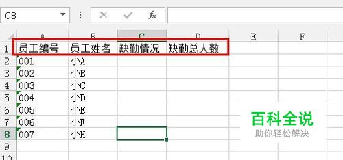 制作Excel表格,填写员工信息,例如从员工编号、员工姓名、缺勤情况、日期等,按照自己的需要做一定的补充,确保需要的信息基本都包含。