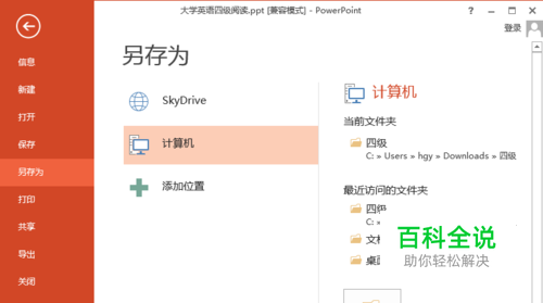 我们打开一个演示文档。点击“文件”>“另存为”。选择一个位置,比如桌面。