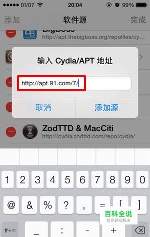 第二步、添加源地址:apt.91.com/7/ 再回到Cydia,依次点击【管理】—>【软件源】—>点击右上角【编辑】—>点击左上角【添加】—>如下图所示输入apt.91.com/7—>【添加源】 提示:如果apt.91.com/7/无法添加,可尝试添加apt.91.com/7