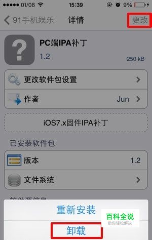 第一步、先卸载你设备中已装的Appsync for iOS 7补丁(即PC端IPA补丁) 打开Cydia,依次点击【管理】—>【软件包】—>找到之前安装的Appsync for iOS 7补丁(即PC端IPA补丁),点击它—>【更改】—>【卸载】