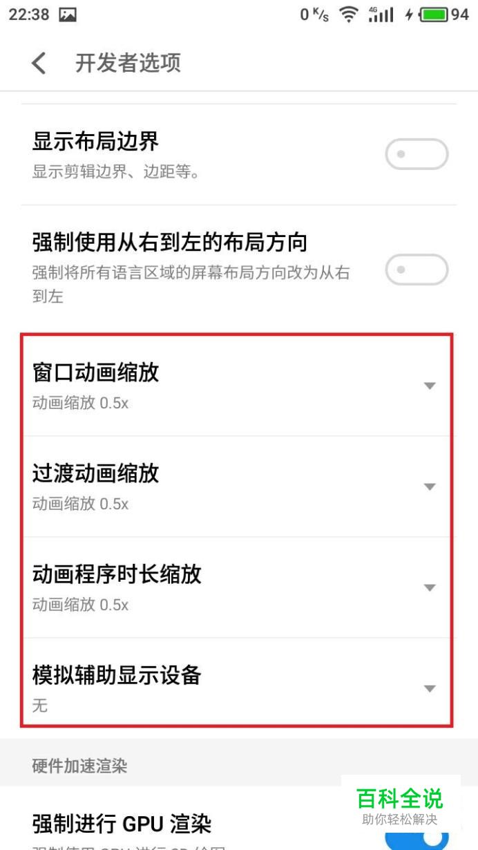 我们往下拉,找到“绘图”中的动画缩放,如下图所示,把三个选项的缩放倍数“1x”改成“0.5x”,改完之后我们可以明显的感觉到,应用的读取速度和画面的过渡都变得快了许多。