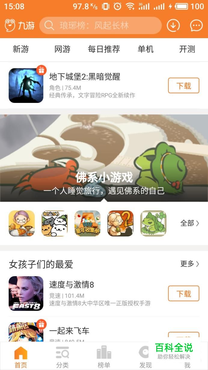 需要知道的是,游戏自带语言只有日文,并且是无法进行更换的,我们在“九游”能够下载汉化版。进入九游界面找到“佛系小游戏”进入。