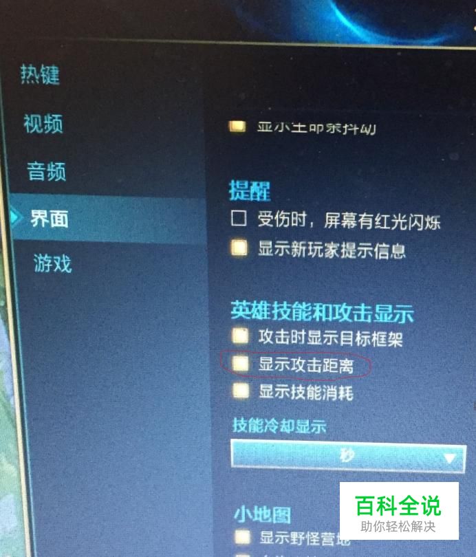 选择“界面”。在“英雄技能和攻击显示”下,勾选“显示攻击距离”