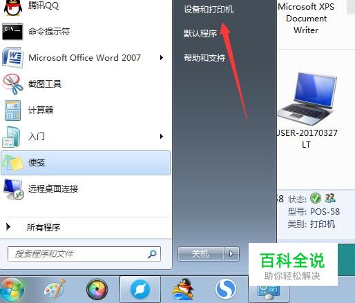 首先点击右下角开始--------设备和打印机,如下图所示。