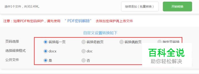 添加完文件后,在文件的下方有一个自定义设置功能,我们可以根据自己的需要转换PDF文件的指定页面,并且选择转换后的word文件格式,如果不想转换的文件被别人看见的话在公开文件后面选择“否”就可以了!