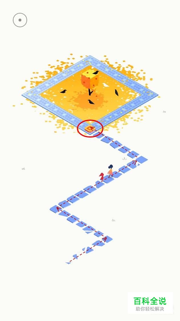 当主人公站到黄色平台上之后从地底下就会上升起来一个建筑物,然后让主人公和小孩跑到图示的位置。然后点击旋转黄色的轮盘,旋转中间的这条道路。