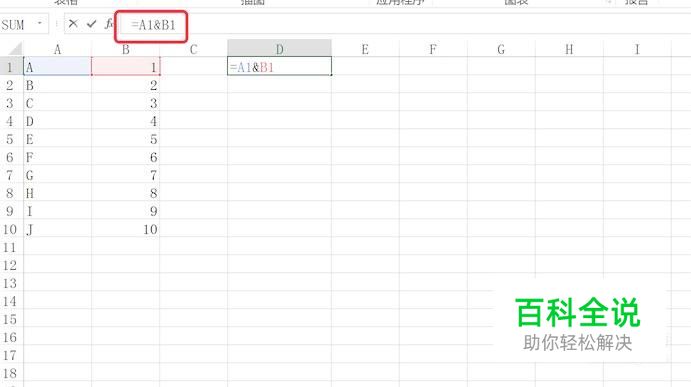 在D1单元格输入公式,=A1&B1,即把A1和B1单元格的数据并在一起。