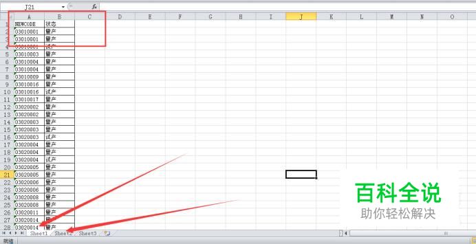 现在我们点开“sheet2”,可以看到已经备好的数据,如图所示,我们先把“状态”这个表头写上,细心的伙伴应该能够发现“sheet2”和“sheet1”的编码是不一样的,但是“sheet2”中所有的编码,“sheet1”中都是有的,不多不少,一模一样,就是顺序不一样而已。