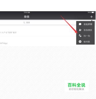 我们要知道,ipad自己是没有扫码的功能的,所以我们需要借助一些软件,比如微信,我们在IPAD里面把微信打开,然后点击右上方的+号,选择扫一扫。