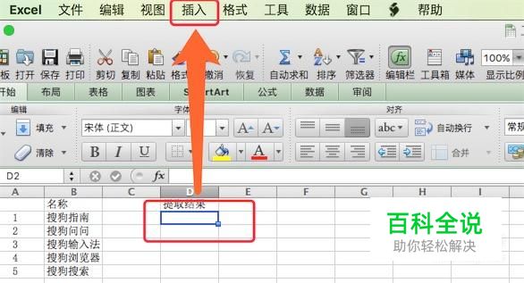 假设要把B列的名称简化,去掉搜狗二个字,把后面的字符提取出来。 要实现这个需求,我们先点击D2单元格,然后点击菜单栏上的‘插入’