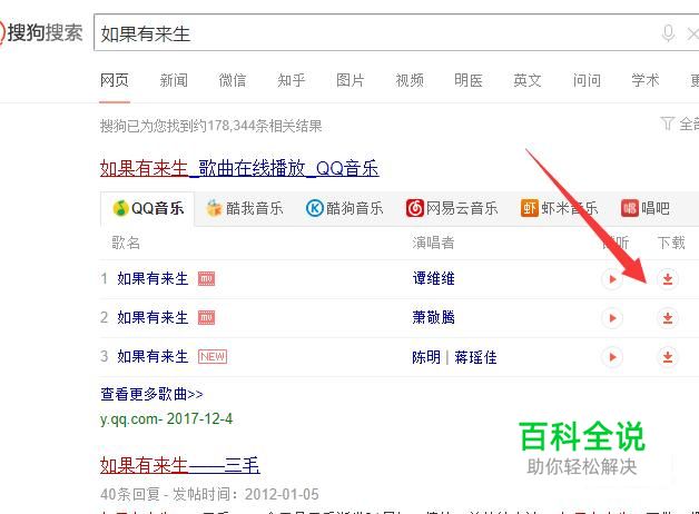 首先我们打开搜狗,找到有版权的地方,然后把音乐下到电脑里,小编这里以“如果有来生”这首歌为例(如图所示)。